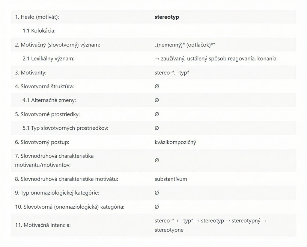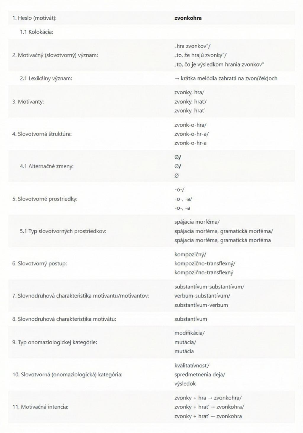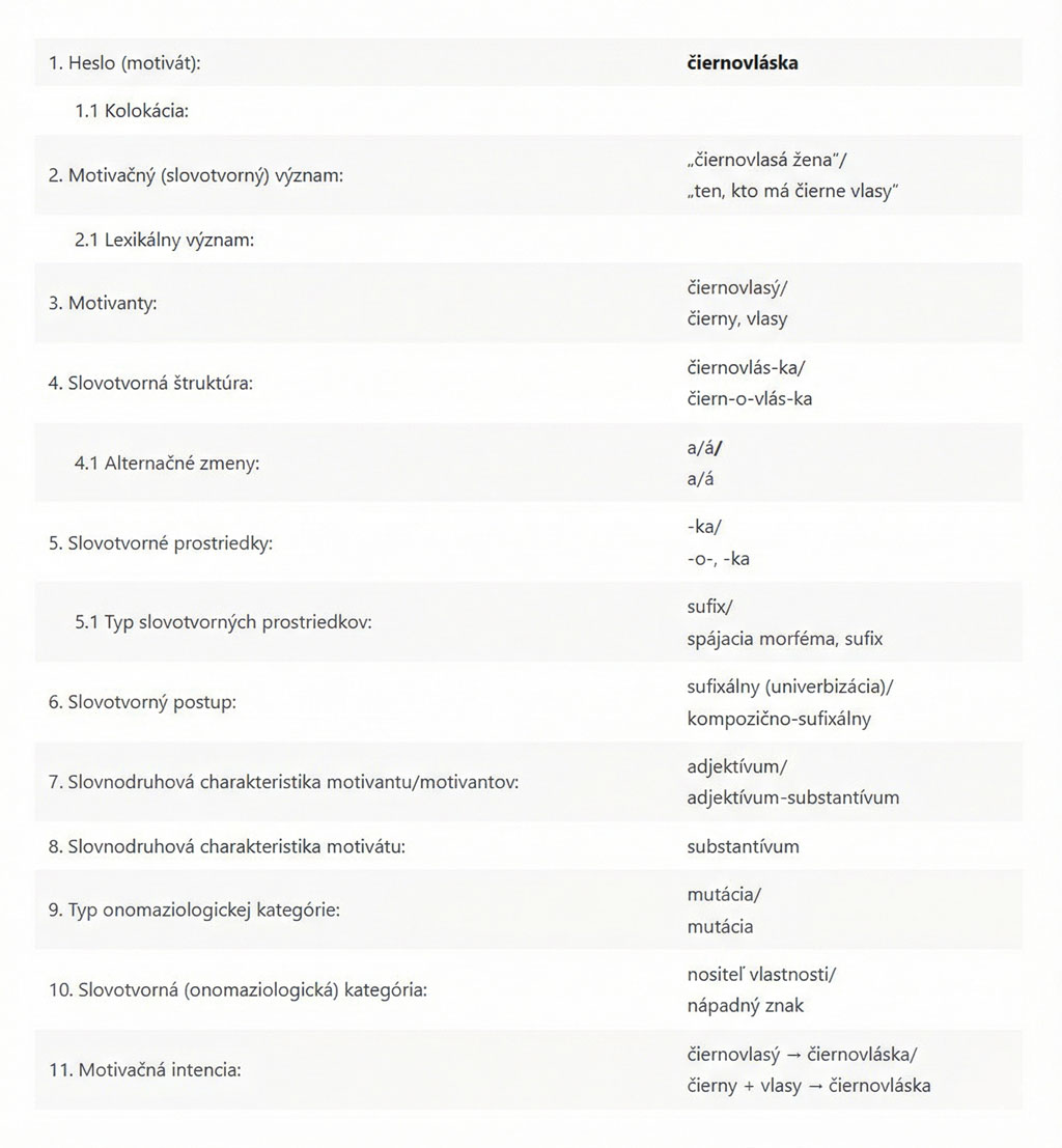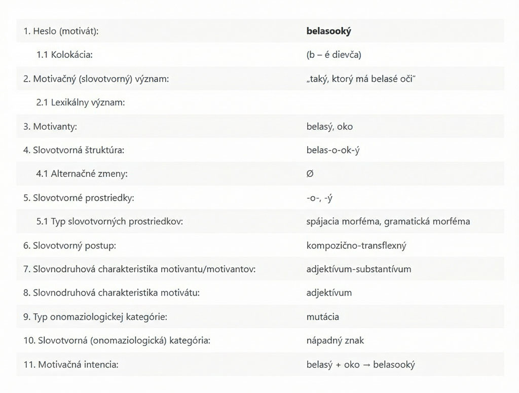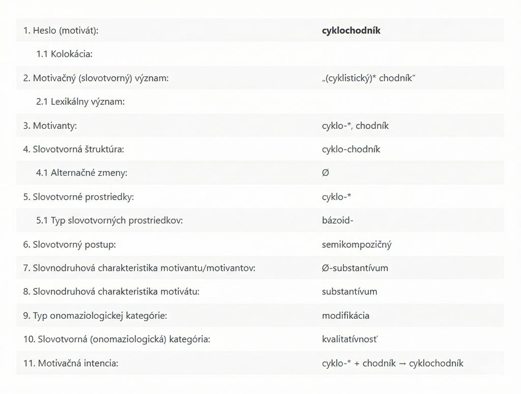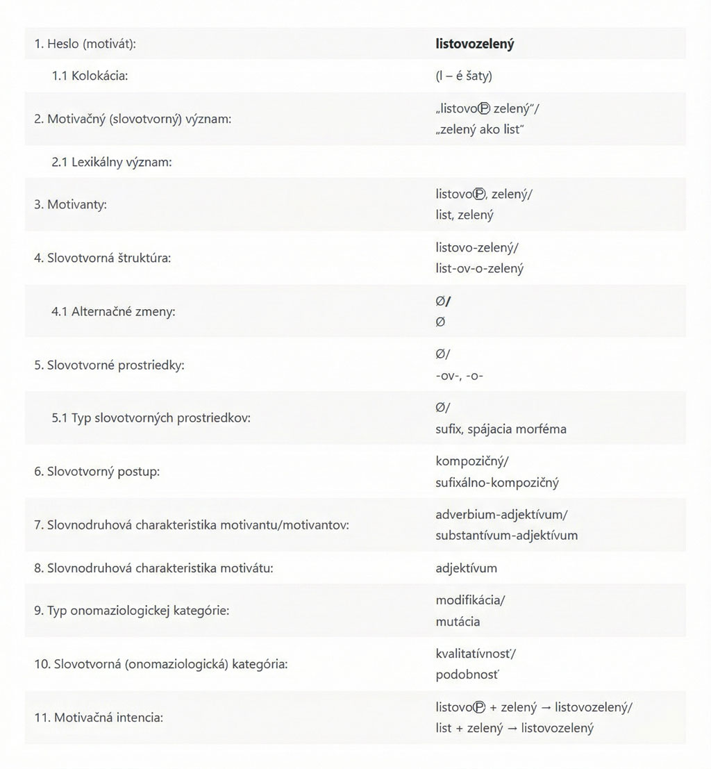 - slovný druh a sémanticko-gramatická špecifikácia motivantu/motivantov + relevantná štylistická charakteristika